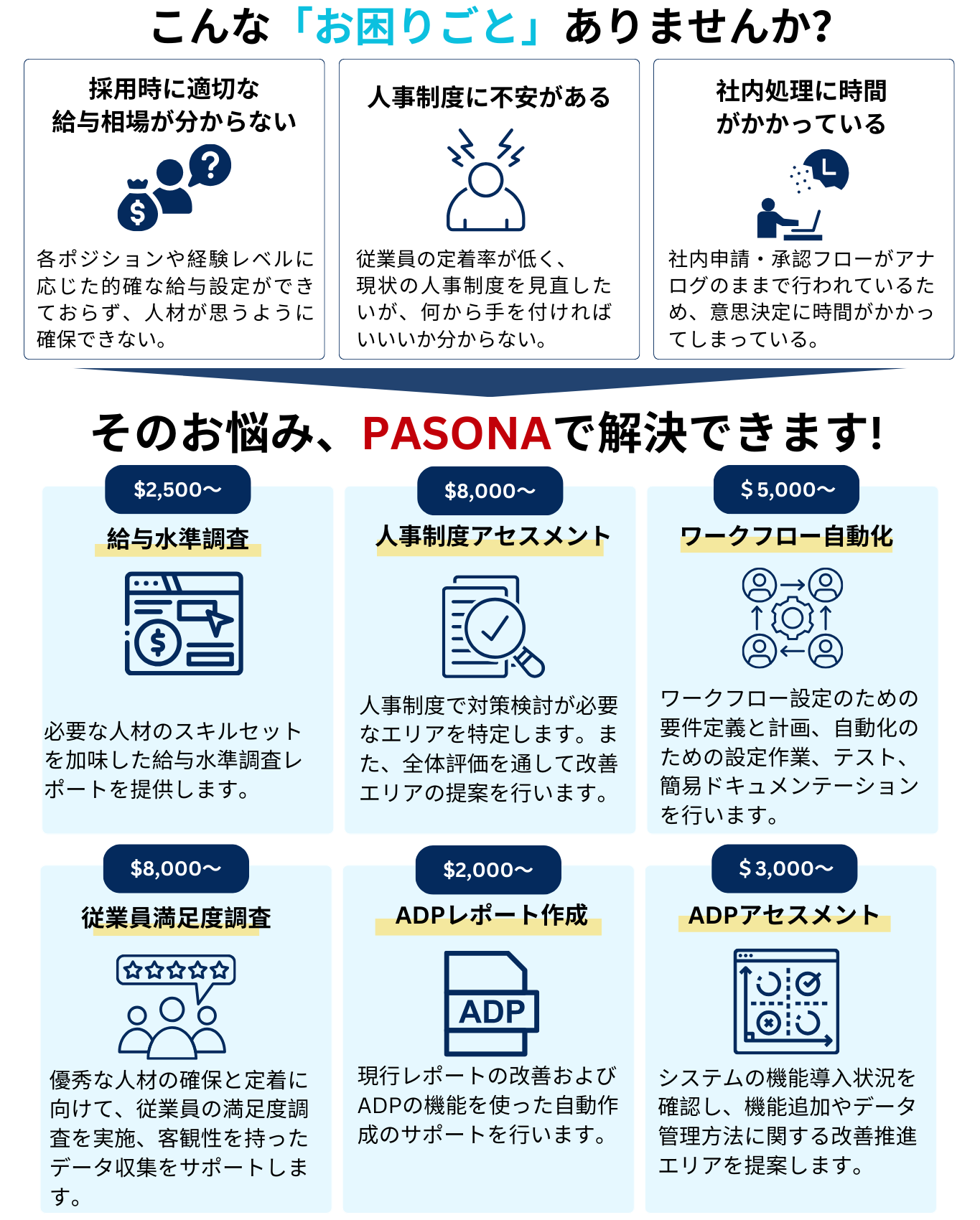 PASONAでは、採用・人事ご担当者のみなさまのお困りごとに対応するサービスを提供しています。